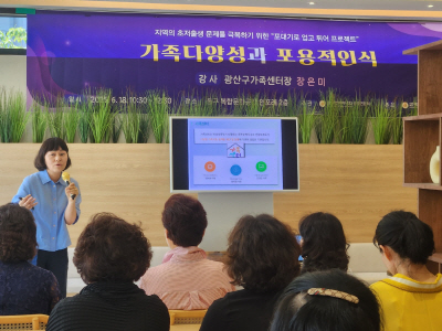 | 장은미 광산구가족센터장이 지난 6월 동구 복합문화공간 인포레에서 ‘가족 다양성과 포용적 인식’이란 주제로 강연을 하고 있는 모습. |