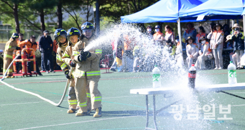 28일 광주 효천물빛노닐터에서 열린 ‘제36회 의용소방대 소방 기술 경연대회’에서 북부 여성의용소방대원들이 4명이 화재를 진압하는 4인조법 시범을 보이고 있다.