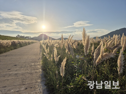 29일 신안군에 따르면 봄철 화려했던 샤스타데이지 꽃 축제를 성공적으로 마무리하며 ‘하얀 섬’의 상징으로 자리 잡았던 장산도 화이트정원은 현재 바람에 흔들리는 팜파스그라스 군락이 가을 하늘과 어우러져 절정의 아름다움을 뽐내고 있다.