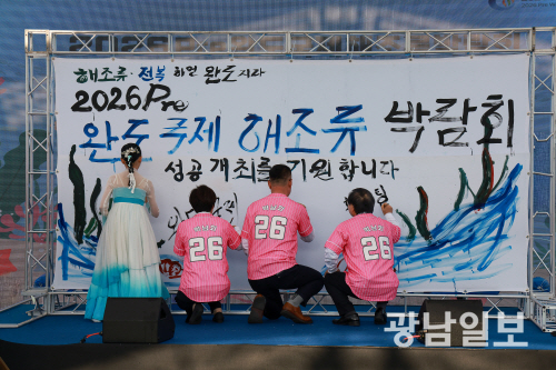 이번 행사에서 보여준 퍼포먼스는 ‘해조류, 전복하면 완도여라! 2026 Pre 완도국제해조류박람회 성공 개최를 기원합니다!’라는 문구를 캘리그라피로 힘차게 써 내려갔다.
