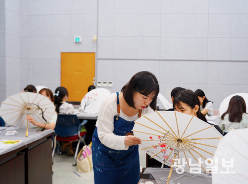 | 정혜진 ㈜치른시빌 대표가 수강생을 대상으로 한지 양산 제작 교육을 하는 모습. |