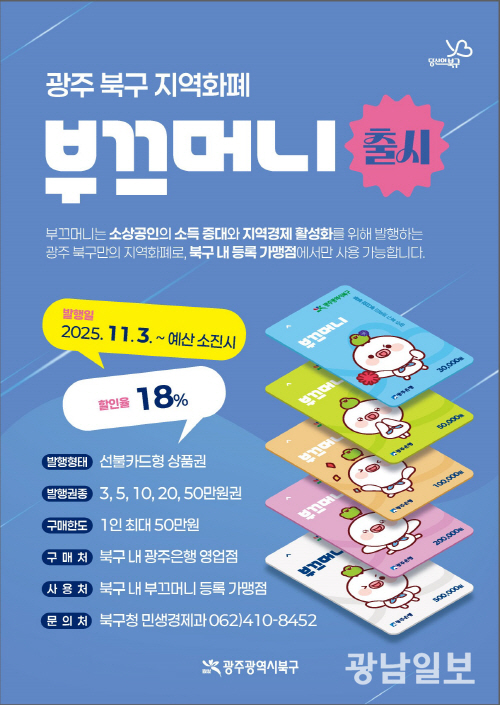 부끄머니는 광주 자치구 중 최대 규모인 100억원 규모로 발행되며, 10월말 기준 1만9200여곳의 가맹점을 확보했다. 북구 대부분의 상점과 식당, 전통시장 등에서 사용 가능해 지역 내 소비 순환을 유도하는 데 큰 역할을 할 것으로 기대된다.