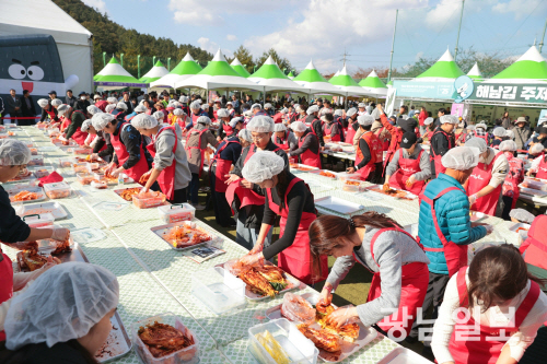 | 2025 해남미남축제에 관광객 등 250명이 참여해 해남 515개 마을을 상징하는 해남배추로 김치만들기를 체험하는 ‘515 김치 비빔’ 행사가 인기리에 진행됐다. |
