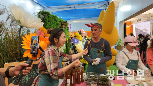 | 해름 네이버 쇼핑라이브 함평군 홍보 통합부스에서 라이브방송을 하고 있는 모습. |