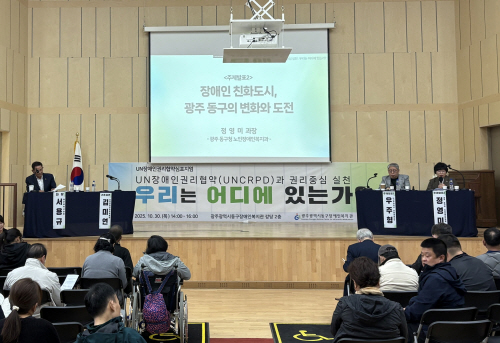 정영미 노인장애인복지과장은 ‘장애인친화도시, 광주 동구의 변화와 도전’을 주제로 광주 동구가 지난해 장애인친화도시로 선포한 이후 무장애 도시 조성, 장애인친화 열린가게 운영, 장애인 일자리 및 여가서비스 확대 등 실제 행정 현장에서의 실천 사례를 공유했다.