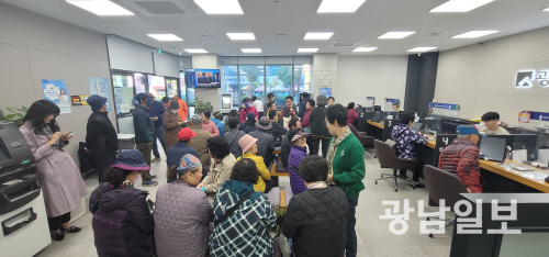 | 3일 오전 9시께 광주 북구 광주은행 문화동지점을 찾은 인파들이 한꺼번에 몰리면서 북새통을 이뤘다. |