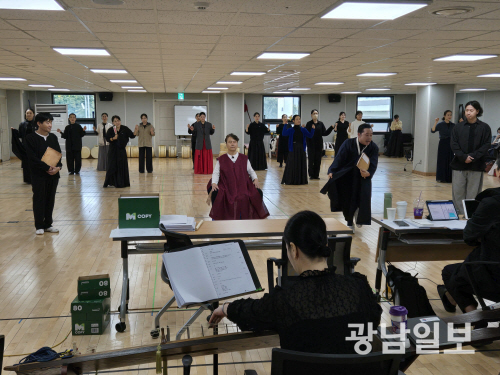 | 광주시립창극단 단원들이 창극 ‘愛(애)춘향’ 공연을 앞두고 무대를 선보이고 있다. |