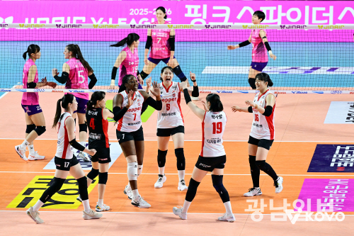 | 지난 2일 흥국생명 배구단과의 진에어 2025-2026 V리그 여자부 1라운드 네 번째 경기에서 세트스코어 3-0으로 승리를 거둔 AI페퍼스 선수단이 기뻐하고 있다. 사진제공=KOVO |
