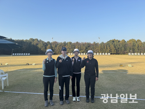 | 양궁 국가대표 2차 선발전을 통과한 광주 궁사들이 기념 촬영을 하고 있다. (왼쪽부터) 최미선, 안산, 오예진, 김수린 |