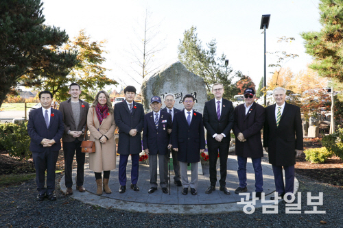| 광양시 방문단은 캐나다 랭리타운십시를 방문, 캐나다 최초로 한국전쟁 참전용사를 기리기 위해 설치된 ‘가평석’을 찾아 헌화·참배했다. |