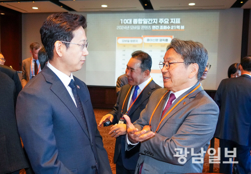 | 강기정 광주시장이 5일 서울 신라호텔에서 열린 ‘제10회 서울미래컨퍼런스’에 참석해 배경훈 과학기술정보통신부 장관과 환담장에서 대화를 나누고 있다. 사진제공=광주시 |