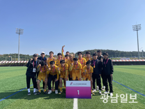 | ‘제45회 전국장애인체육대회’에서 우승을 차지한 지적축구팀 FC광주엔젤이 기념 촬영을 하고 있다. |