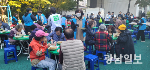 이날 현장에는 (사)대창한마음회, 북구녹색어머니회, 어울림사랑나눔봉사회, 에움아리 등 40여명의 봉사자들이 참여했다. 자원봉사자들은 이날 일찌감치 모여 음식 준비와 탁자·의자 세팅, 배식 준비를 위해 분주히 움직였다.