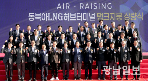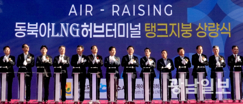 | 김영록 전남도지사가 5일 여수 묘도 LNG허브터미널 현장에서 열린 ‘LNG탱크지붕 상량식’ 행사에서 주요 내빈들과 상량식 세리머니를 하고 있다. 사진제공=전남도 |