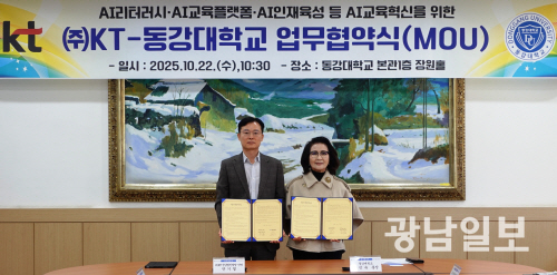 동강대는 최근 본관 1층 장원홀에서 이민숙 총장과 KT전남법인 고객담당 안기청 단장이 참석한 가운데 ‘AI 교육혁신’을 위한 업무협약을 맺었다.