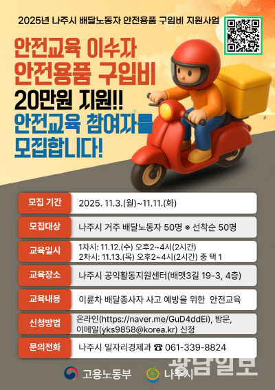 7일 나주시에 따르면 2025년 고용노동부 노동약자 일터개선 지원 공모사업 선정됨에 따라 사업비 1283만원을 투입, 배달노동자 안전용품 구입비를 지원한다.