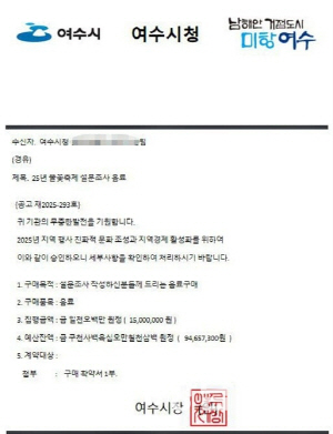 공문에는 불꽃축제 설문조사에 참여한 시민에게 제공할 음료 구입 예산을 승인한다는 내용이 담겼으며, 가짜 여수시장의 직인까지 찍혀 있었다고.