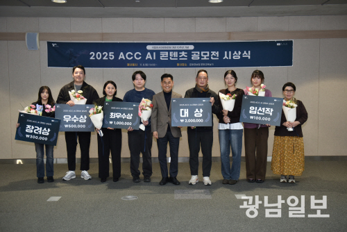 | 국립아시아문화전당(ACC, 전당장 김상욱)은 8일 오후 문화정보원 문화교육실5에서 ‘ACC 인공지능(AI) 콘텐츠 공모전 시상식’을 가졌다. 사진은 2025 ACC AI콘텐츠 공모전 시상식 단체 모습. |