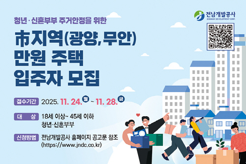 입주자는 자격요건 검증을 거쳐 공개 추첨으로 선정되며, 일정은 △11월 말 접수 △12월 자격 검증 △2026년 1월 입주자 추첨 및 입주 순으로 진행된다. 자세한 사항은 전남개발공사 홈페이지(https://www.jndc.co.kr)에서 확인할 수 있다.