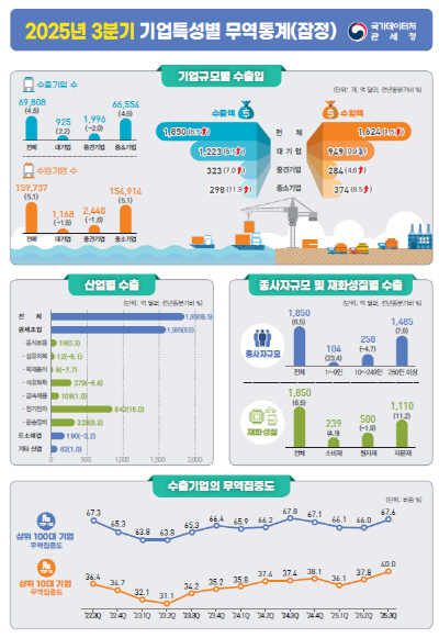 국가데이터처가 10일 발표한 2025년 3분기 기업특성별 무역통계 결과(잠정)에 따르면 올해 3분기 수출액은 1850억달러로 전년 동기(1736억달러) 대비 6.5% 증가했다. 2010년 통계 작성 이래 최대 규모다.