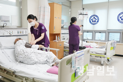 | 조선대병원 간호사들이 입원 환자를 살피고 있다. |