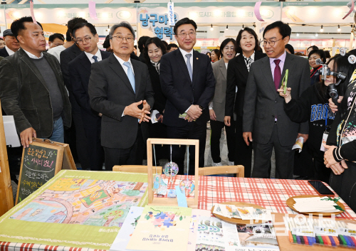 윤호중 행정안전부 장관이 10일 오전 광주시청 시민홀에서 열린 2025 광주 주민자치-공동체 한마당에서 강기정 광주시장및 내빈들과 함께 행사장을 둘러보고 있다.