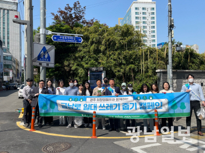| 대인동 예술담길 골목형상점가와 광주 AI창업캠프 입주업체는 최근 금남로 일대 쓰레기 줍기 캠페인을 진행했다. |
