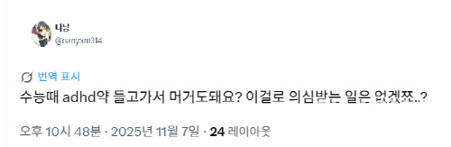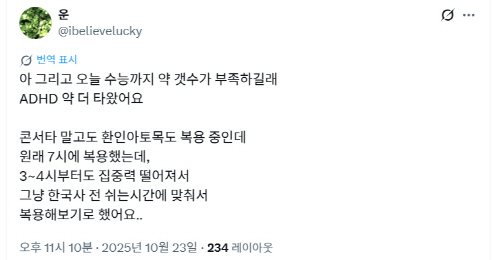 이 밖에도 ‘수능까지 약 개수가 부족하길래 ADHD 약 더 타왔다’, ‘콘서타 말고도 환인아토목도 복용 중인데 시험 전에 시간 맞춰서 복용해보기로 했다’ 등의 글도 다수 확인되고 있다.