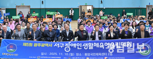 10일 광주 서구 풍암국민체육센터에서 열린 ‘제5회 광주시 서구 장애인생활체육대회’에서 김이강 서구청장과 참석자들이 기념촬영을 하고 있다.