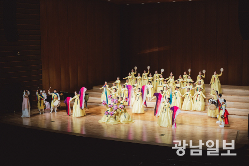 나주배를 상징하는 금빛 한복을 입은 단원들은 국악기와 어우러진 한국적 연출로 무대를 감동으로 물들였다.