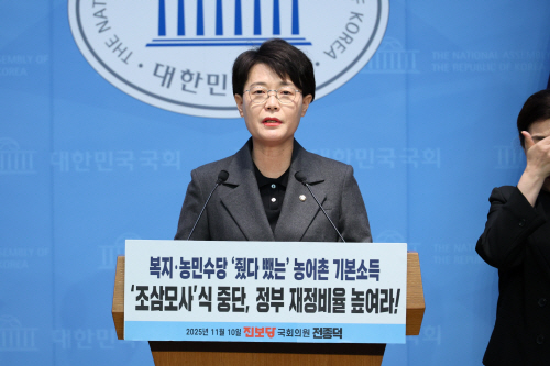 | 진보당 전종덕 의원은 10일 오전 국회 소통관에서 기자회견을 열고 “농어촌 기본소득 시범사업으로 선정된 지자체들이 복지예산과 농업예산을 삭감해 농어촌 기본소득사업 재원을 확보하고 있다”며 시정을 촉구했다. [전종덕 의원실 제공] |