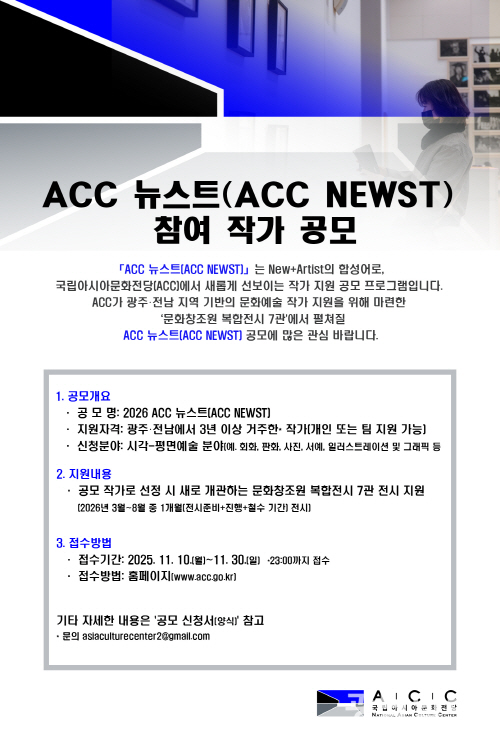 ACC는 1차 서류심사, 2차 작가발표를 거쳐 오는 12월 ‘뉴스트’ 최종 참여자를 선발한다. 선정된 작가에게는 전시 공간(복합전시7관) 및 창작비, 홍보 등을 지원할 예정이다. ‘2026 ACC 뉴스트’ 전시는 내년 3~8월 중 복합전시7관에서 만나볼 수 있다.