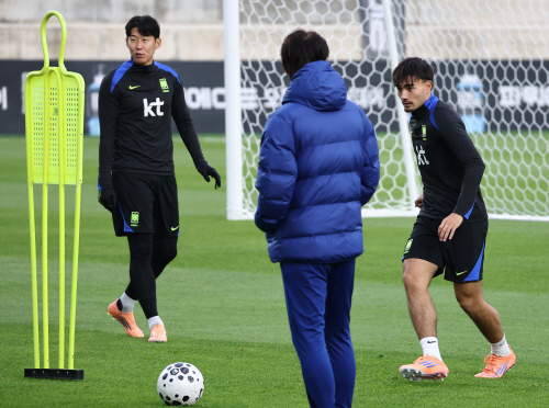 | 축구대표팀 옌스 카스트로프와 손흥민이 11일 충남 천안 대한민국축구종합센터에서 진행된 오픈 트레이닝에서 집중하고 있다. 연합뉴스 |