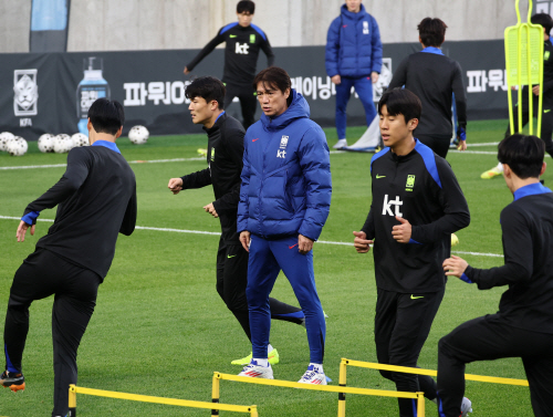| 홍명보 축구대표팀 감독이 11일 충남 천안 대한민국축구종합센터에서 진행된 오픈트레이닝에서 선수들에게 지시를 내리고 있다. 연합뉴스 |