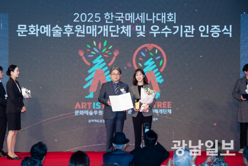 | 광주문화재단은 지난 11일 서울에서 열린‘2025년도 문화예술후원매개단체 및 문화예술후원우수기관 인증식’에서 문화체육관광부와 한국문화예술위원회로부터 ‘문화예술후원매개단체 신규 인증서’를 수여받았다. |