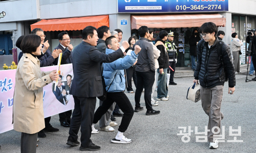 2026학년도 대학수학능력시험일인 13일 오전 광주시 교육청 26지구 제21시험장인 광주 서석고등학교에서 이정선 교육감이 한 수험생이 친구를 응원하 고 있다.