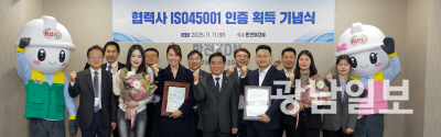 | 한전KDN은 최근 광주전남공동혁신도시에 위치한 본사 대회의실에서 ‘협력업체 ISO45001 인증 획득 기념식’을 개최했다. |