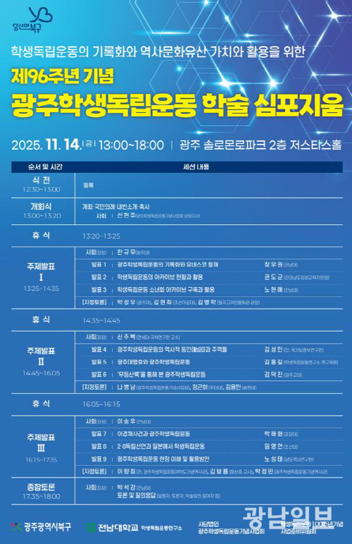 발표 이후에는 박석강 전남대의 교수 주도로 발표자와 토론자, 주민이 함께 참여하는 종합토론이 이어져 학생독립운동의 기록화와 가치 확산 방향을 심도 있게 논의할 계획이다.