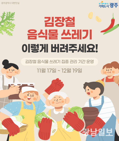 정미경 시 자원순환과장은 “김장철 올바른 음식물쓰레기 배출을 위해 배추·무·젓갈류는 염분을 제거하고 잘게 절단해 음식물류 폐기물 전용용기에 배출하고, 흙이 묻은 채소류는 이물질을 제거한 후 스티커를 부착한 종량제봉투에 배출하는 등 음식물쓰레기 줄이기에 적극 동참해달라”고 당부했다.