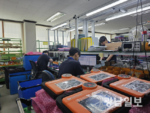 | ㈜나눔테크 직원들이 입고검사장에서 제품 조립과 성능테스트를 진행하고 있다. |