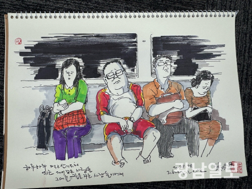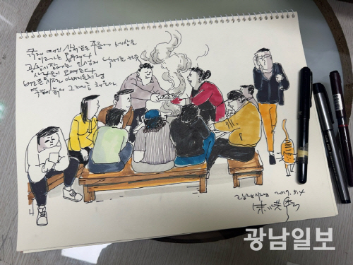 주 대표는 “모나미 볼펜 한 자루와 종이만 있으면 세계 어디를 가든 누구든지 친구가 될 수 있는 주홍수 작가를 광주에 모셨다. 잔잔한 위로를 건네는 그림들로, 그의 그림 속 한 사람 한 사람은 관객이 보는 순간 다정한 ‘우리’가 된다. 그림 속에서 말을 걸어오기 때문이다. 그가 백지에 볼펜으로 쓱쓱 그려가는 과정을 보고 있으면 5분만에 하나의 에피소드가 나타난다. 사람과 사람들이 어울려 살아가는 삶의 현장들이 아날로그 방식으로 다정하게 말을 걸어온다”며 “작가의 그림을 보며 그림 속에서 ‘우리’가 돼 삶의 재미와 맛을 느껴볼 수 있는 전시”라고 전했다.