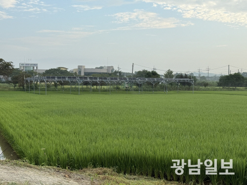 영암군은 2023년 농림축산식품부의 예산을 지원받아 지난해 농업기술센터 직영 논 1000㎡ 면적에 45kW 규모의 영농형 태양광 설비를 설치했다.
