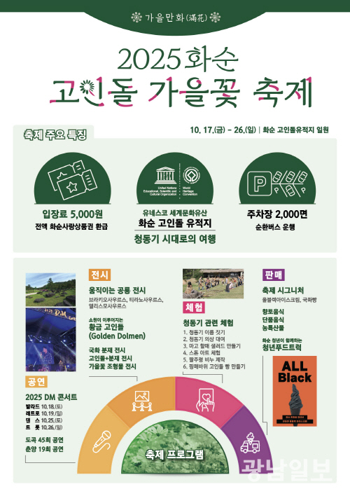 9일 화순군에 따르면 2023~2024년 2년 연속 축제 콘텐츠 대상에 선정된 화순 고인돌 가을꽃 축제는 가을꽃과 청동기 체험, ‘가을만화’와 ‘고인돌 유니버스’로 정체성과 재미를 강화해 총 7개 구역에서 부대행사(2개) 포함 총 24개의 프로그램을 운영한다.