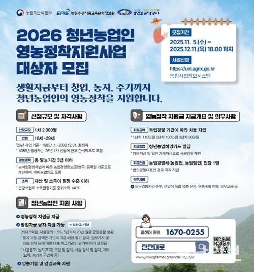 해당 사업은 만 40세 미만 독립경영 예정자 또는 독립경영 3년 이하 농업인이 신청 가능하며, 선정되면 최장 3년간 월 90만~110만원의 지원금이 지급된다.