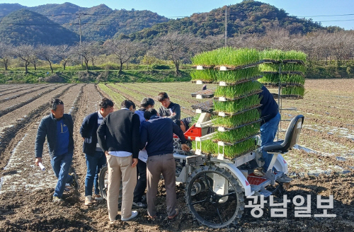 | 나주시농업기술센터는 지난 14일 문평면 일원에서 지역 농업인들이 참석한 가운데 승용 정식기를 활용한 양파 기계 정식 연시회를 갖고 기계화 정식의 효과와 적용성을 소개했다. |