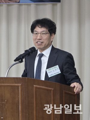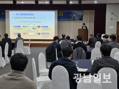 | 노건기 전 산업통상부 통상교섭실장이 18일 광주 북구 광주테크노파크 12층 국제회의장에서 열린 (사)에너지밸리포럼 제79차 정례 포럼에서 ‘글로벌 통상환경과 에너지’란 주제로 강연을 하고 있다. |