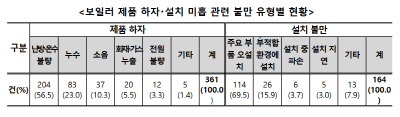 세부 유형별로는 제품 하자 중에는 난방·온수 불량이, 설치 불만 중에는 배관·연통 등 주요 부품을 잘못 설치한 사례가 각각 가장 많았다.