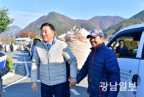 | 김한종 장성군수(왼쪽)가 지난 17일 북하면 쌀 수매 현장을 방문해 농업인들에게 감사 인사를 전했다. |