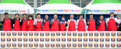 | 김영록 전남도지사가 20일 도청 만남의 광장에서 도내 어려운 이웃에 따뜻한 나눔을 실천하기 위해 열린 ‘2025 김장김치 담그기 및 나눔행사’에 참석해 내빈들과 기념촬영을 하고 있다. |