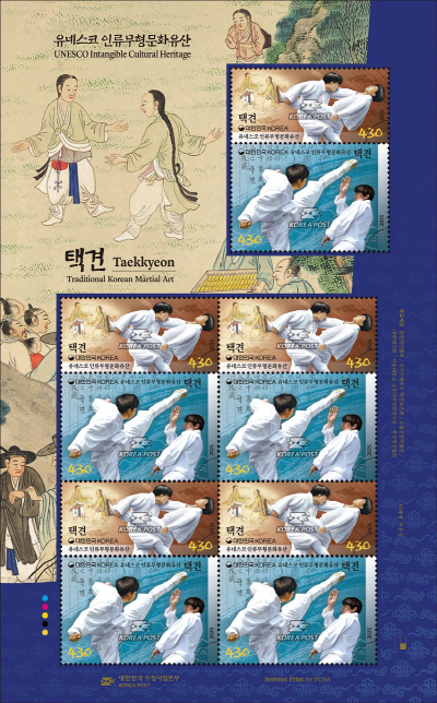 기념우표에는 공격과 방어가 조화롭게 어우러진 택견의 주요 동작이 담겨있다. 택견은 다른 무술에 비해 섬세하다. 부드러운 곡선의 몸놀림으로 공격과 방어를 구사할 수 있다는 점이 특징이다. 조선시대 주로 서민층을 중심으로 명절이나 잔칫날에 즐겨 행해졌다. 신윤복과 유숙의 ‘대쾌도(大快圖)’에서 그 생생한 모습을 확인할 수 있다.